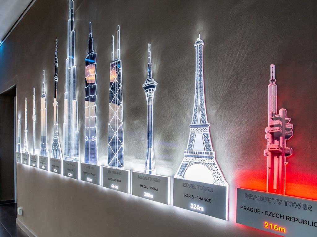 V každé z vyhlídkových kabin objevíte jiné zajímavosti. První prostor vyhlídkové kabiny vám představí federaci světových věží a ty nejznámější z nich. V další kabině jsou proslulá bubble chairs, ze kterých se můžete kochat krásnou Prahou. Každé křeslo disponuje vlastním reproduktorem, které vám promítá zvuky z ulice 100 metrů pod vámi. Poslední kabina slouží jako expoziční a vždy představuje umění českého původu, tedy českých umělců. Jedná se o pravidelné výstavy maleb, fotografií, koláží a dalších děl.